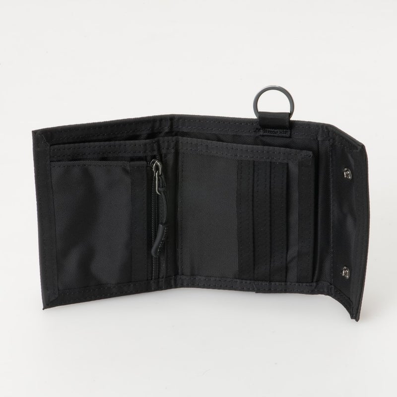 マットな質感と防水性を備えた、都会的なユーティリティーシリーズ。 無地ベースにロゴをあしらったシンプルなデザインで、カジュアルスタイルになじみやすい仕上がりです。 手に取ると、クッション性のあるやわらかな手触りも魅力です。 薄型の三つ折り財布。 内側にカード段やファスナー式の小銭入れ、お札入れを備え、すっきりとコンパクトなサイズ感に収まっています。 付属のリングにストラップやチェーンを付ければ、外出時の使い勝手もさらに高まります。 毎日の持ち歩きに、シンプルさと使いやすさを求める方におすすめです。